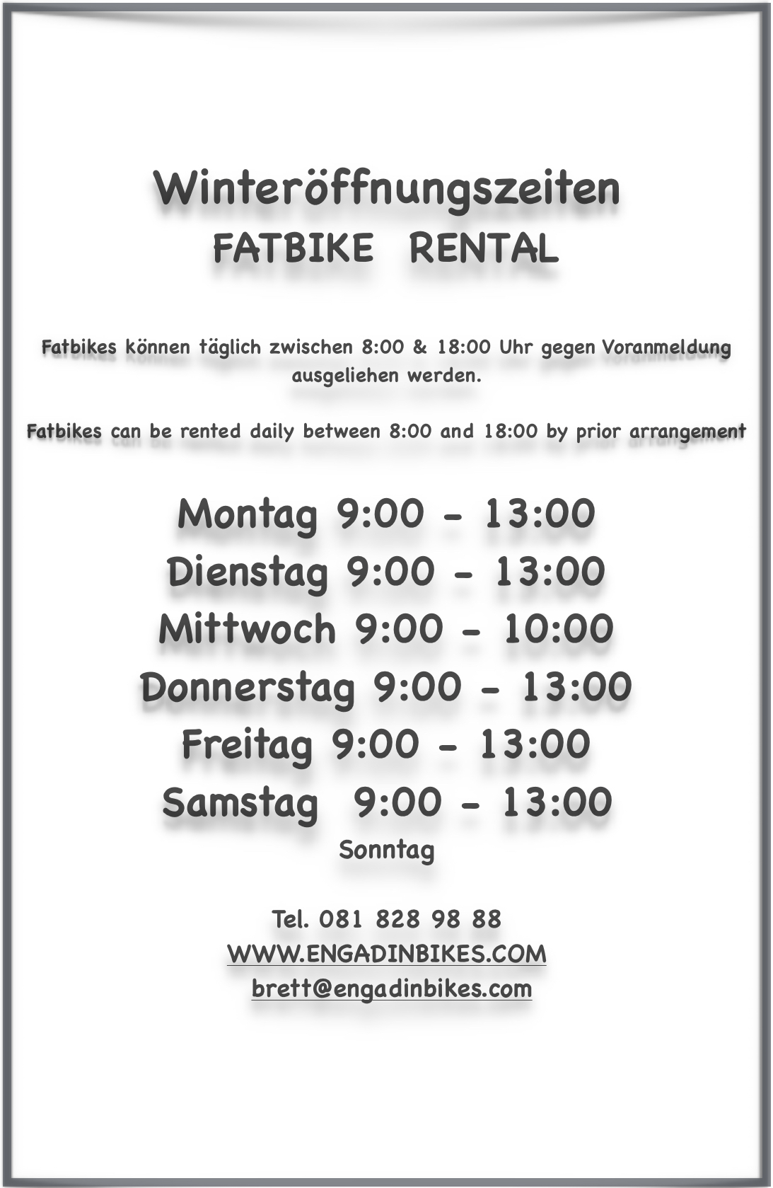 Fatbikes/Winter Bikes können täglich zwischen 8:00 & 18:00 Uhr gegen Voranmeldung ausgeliehen werden.
